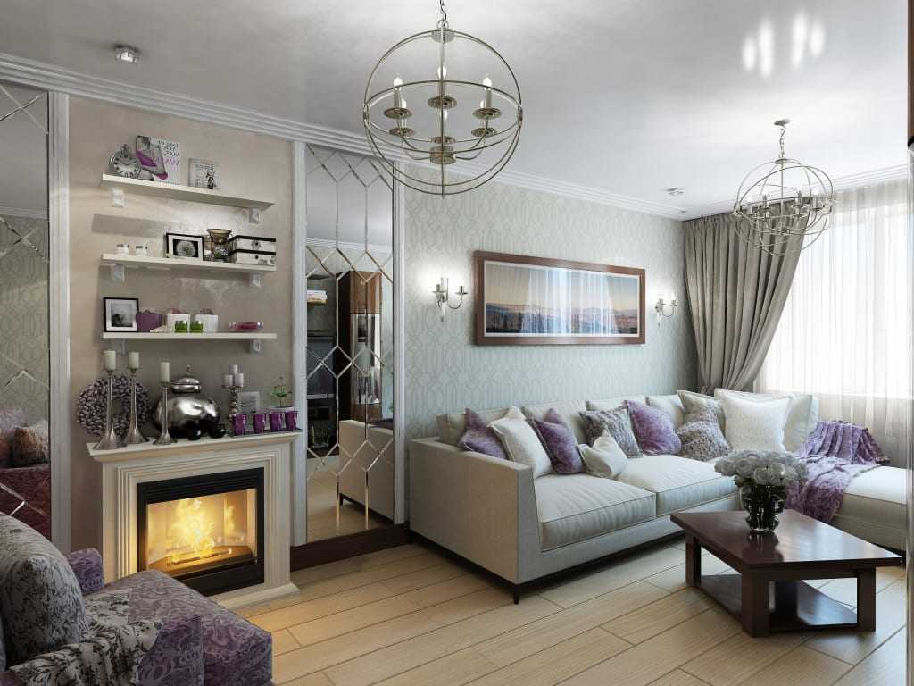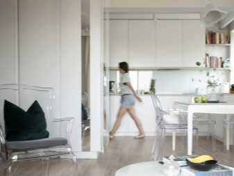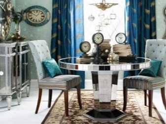 Проявить настрой на необычный вид можно за счет прозрачной либо зеркальной мебели. Неплохой прием для декорирования в сочетании с визуальным зонированием — выкладка мелких ковриков. За счет грамотной расстановки зеркал можно нарастить пространство. Некрупный ковер, закрывающий пол лишь частично, позволяет успешно справиться с ощущением нехватки места.