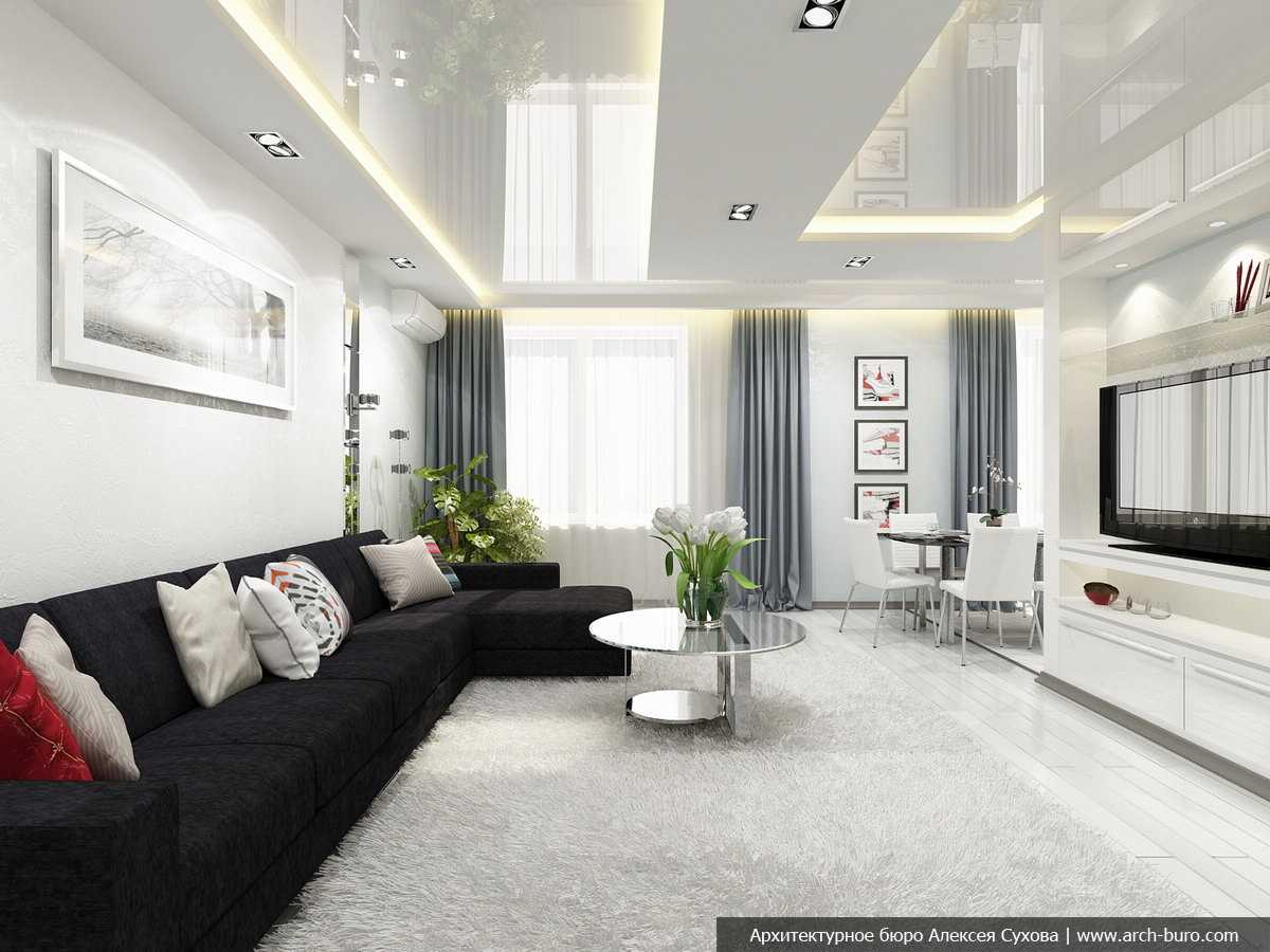 В проектах квартир 31-32 кв. м гостиная является главной функциональной зоной. В ней выделяют обеденную зону, спальню, детский уголок, рабочее место. Основа интерьера — диван, который может быть различных форм и цветов. Диван должен быть малогабаритным, но при необходимости раскладываться в полноценное спальное место.