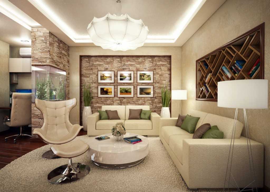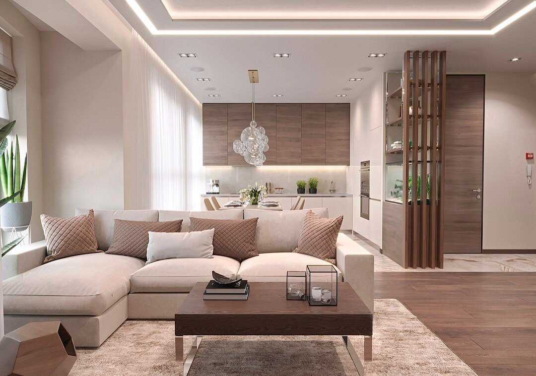 Перегородка между зонами позволит органично вписать тв-тумбу посреди комнаты. Напротив расположится диван, кофейный столик и пара кресел. Однако совсем необязательно располагать в гостиной много мягкой мебели. Пространство можно использовать, например, для размещения книжных шкафов или рабочего места.