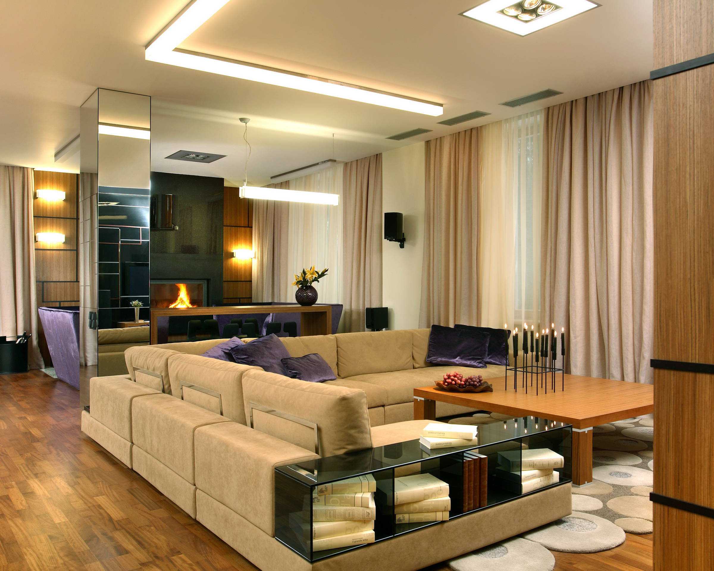Разделить гостиную можно при помощи мебели, например, дивана, который необходимо поставить перпендикулярно стене.