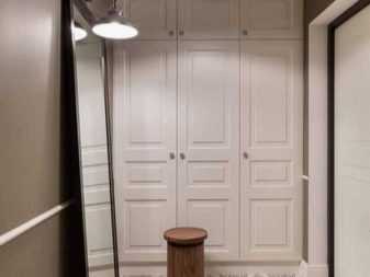 Небольшая прихожая в квартире должна иметь достаточно места, для хранения верхней одежды и обуви. Для этого рекомендуется установить встроенный в стену шкаф с зеркальной поверхностью. Для экономии пространства на стены вешают вместительные полки. Лучшие идеи интерьеров на фото: