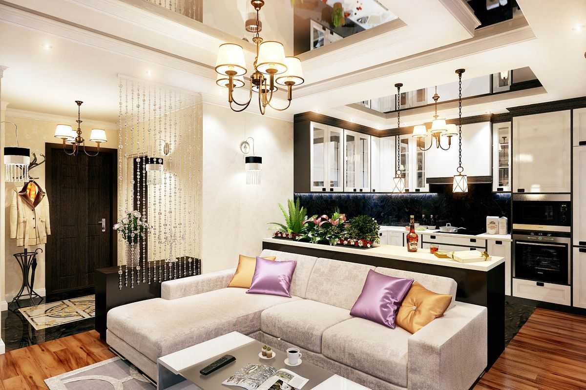 Перепланировка относится к разряду самых радикальных затей. Чтобы увеличить пространство, можно совместить дизайн гостиной и кухни либо же гостиной и коридора. Во втором случае получится зал-столовая.