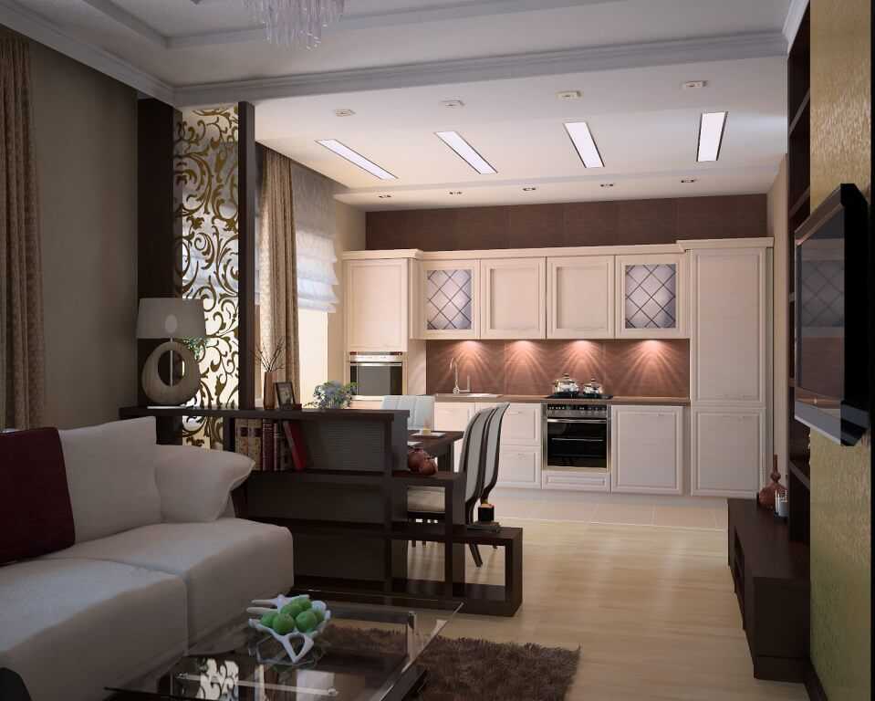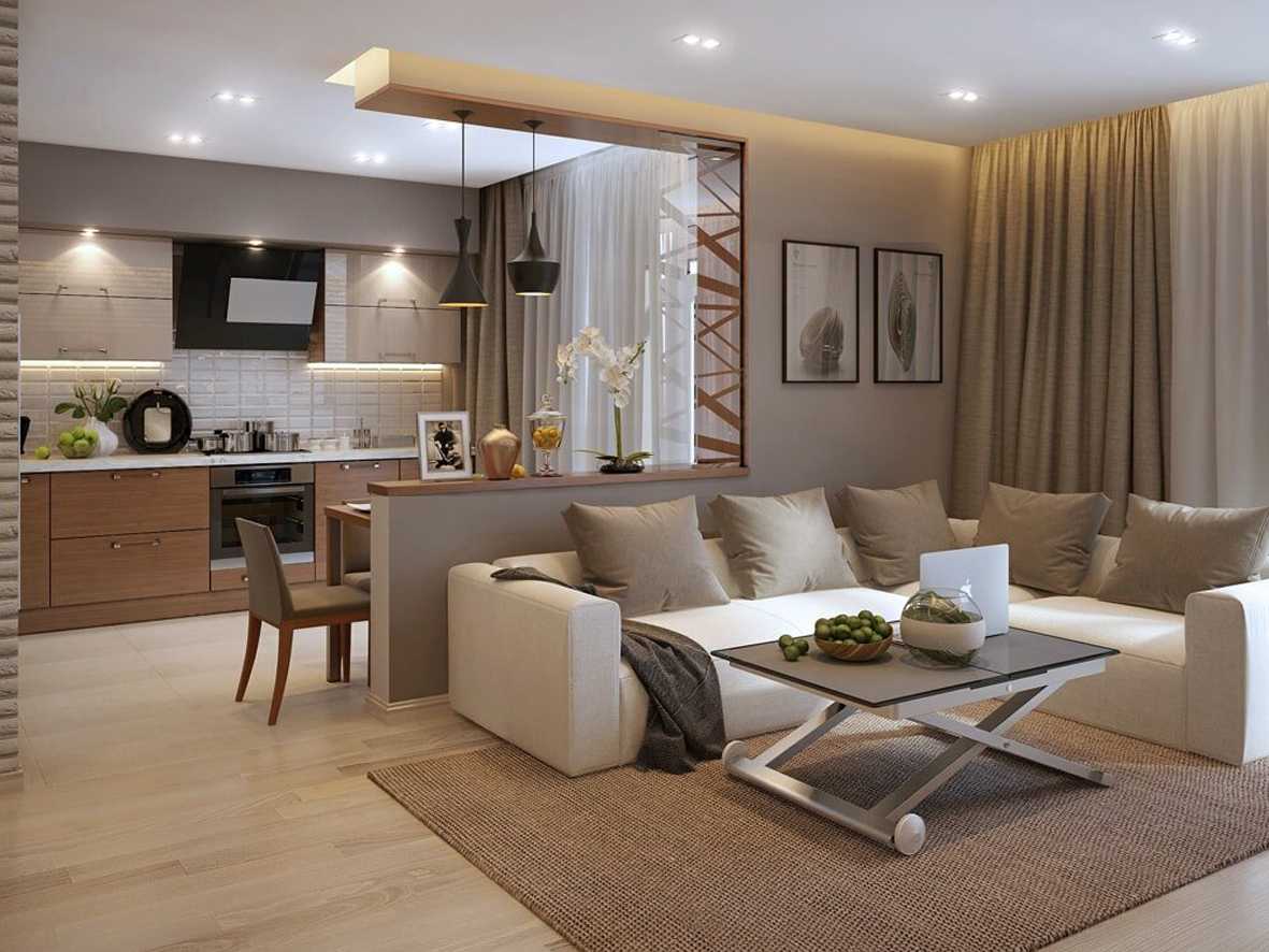Переходом в гостиную зону может стать покрытие пола, легкая раздвигающаяся занавеска из ткани.