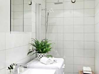 Смежный санузел оформляется в стиле минимализм. Дизайн керамической плитки должен быть выполнен в спокойных оттенках: серый, белый, голубой, синий. Для экономии пространства используют душевую кабину или угловой поддон. Для хранения бытовой и косметической химии можно установить тумбу под раковину и навесной шкафчик. Фото дизайна ванной комнаты в квартире: