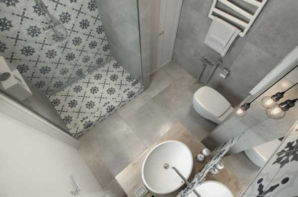 Умывальник, унитаз и душевая кабина из одного комплекта, что не нарушает целостности помещения. В квадратной ванной комнате кабина устанавливается в углу, рядом с ней целесообразно вмонтировать умывальник, с другой стороны — инсталляцию.