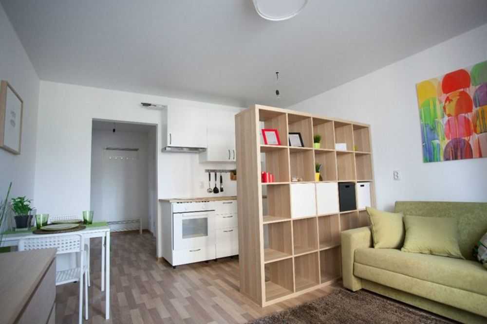 Разделить площадь на зоны поможет гипсокартон. Из данного материала получаются отличные перегородки оригинальной формы. Если такой вариант неуместен в жилище 26 метров, можно воспользоваться разделением площади с помощью меблировки.