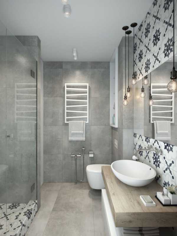 Несмотря на небольшую площадь (3,9 кв. м), ванная комната содержит все необходимое, включая встроенный шкаф и полки для аксессуаров над унитазом и в душевой кабине. Отделка выполнена кафельной плиткой серых тонов и включает привлекающие взгляд фрагменты с красивым узором. Подвесы-лампочки выступают в роли декора и удачно дополняют интерьер комнаты. Под туалетным столиком находится удобный выдвижной ящик для хранения принадлежностей.