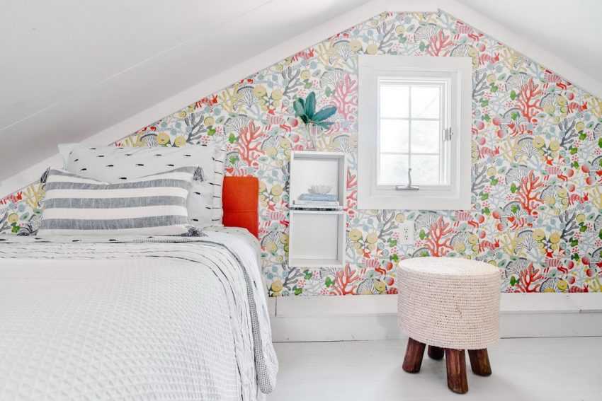 Использование фотообоев на стене в спальне на мансардном этаже помогает создать дополнительное ощущение уюта и обжитости пространства, а также подчеркнуть оригинальность планировки.