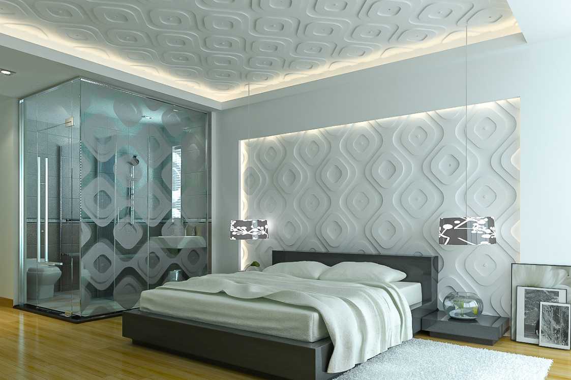 3. Спальня. Дизайнеры советуют использовать для облицовки рельефную непрозрачную плитку. Это могут быть выпуклости и шероховатости, деревянные узорчатые поверхности либо белая гипсовая волна.