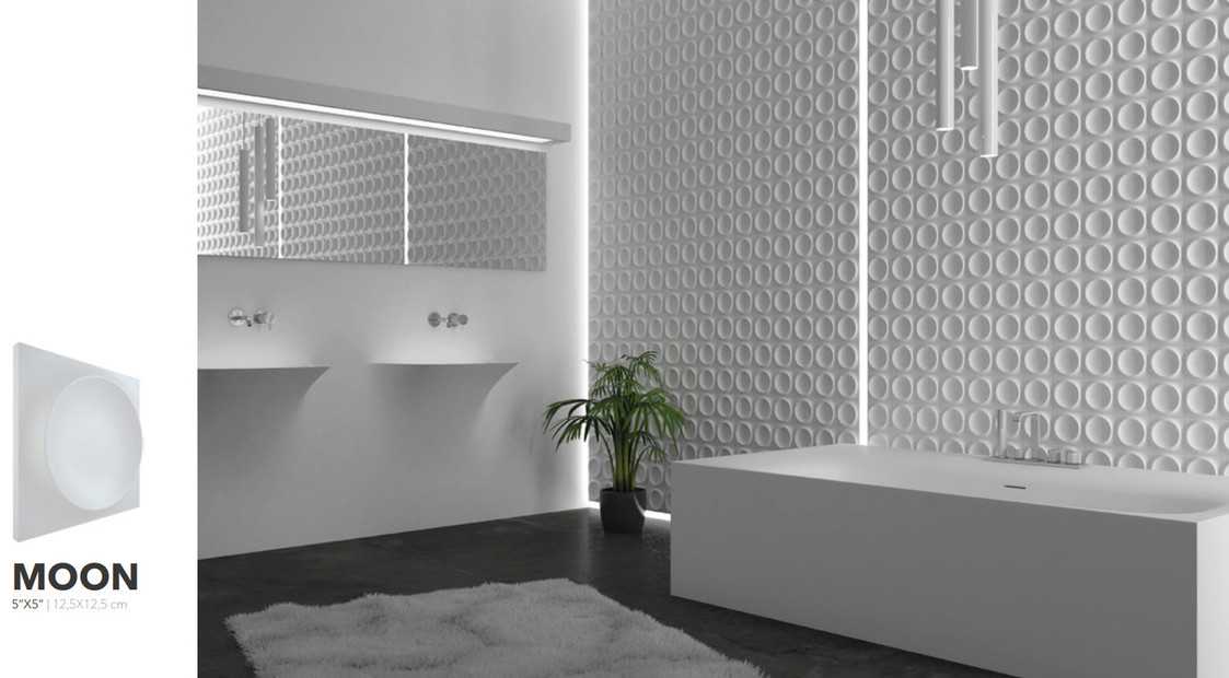 - 3D-изделия для стен ванной с рисунком подчеркнут минимализм площади;