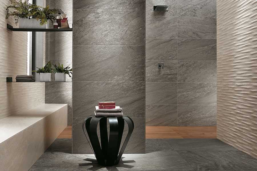 Эффективно для такого дизайнерского решения сочетание керамогранитного напольного покрытия с отделкой под дерево и фактурной настенной облицовки с зонированием 1:1.