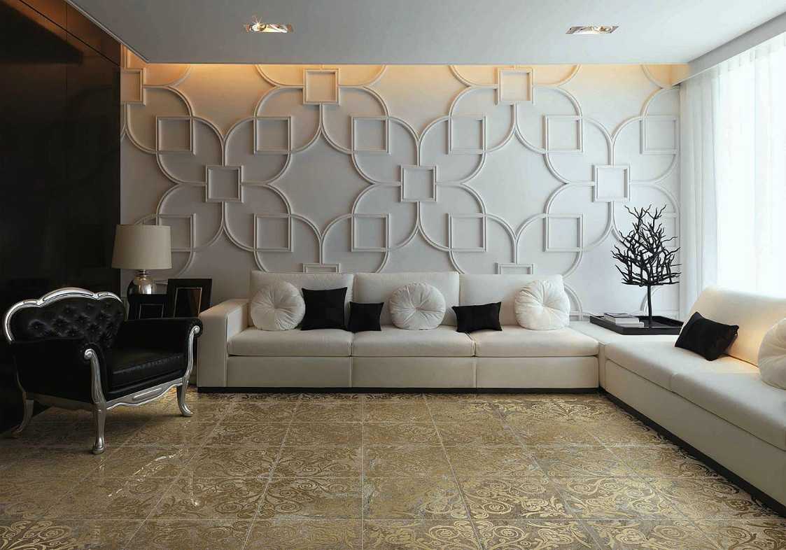 2. Гостиная. Для этой комнаты лучше всего подходят плитка 3D, в основном, однотонная. Эффектно будут выглядеть такие узоры: ветки, листва, геометрия