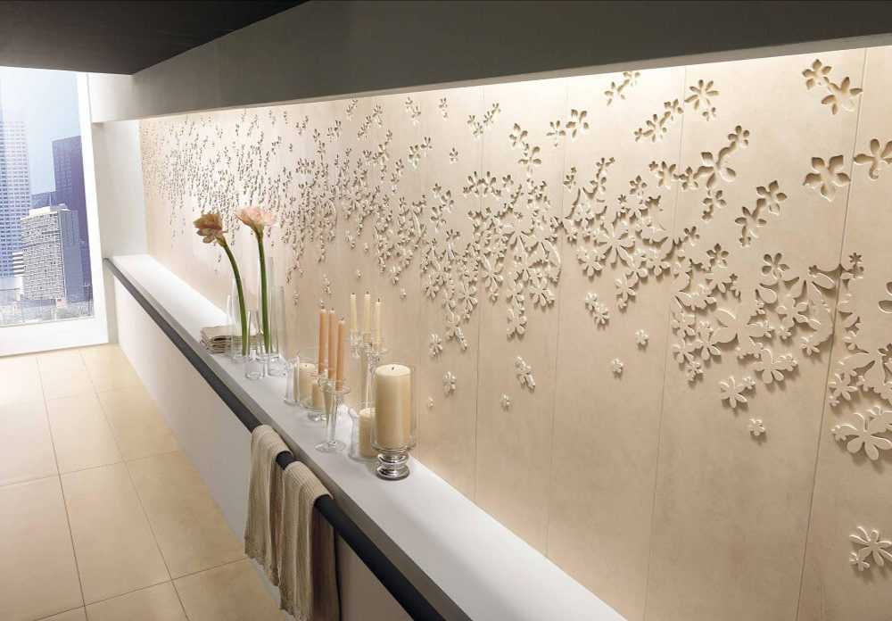 Необычным решением является плитка-панно. Она сочетается с натуральным камнем, кафелем, керамической либо стеклянной мозаикой. Плитку-панно 3D можно применять для украшения потолков в определенных зонах. Окраска плитки может оказаться любой: кремовой, белой, бежевой, светлой серой, с металлическим отливом.