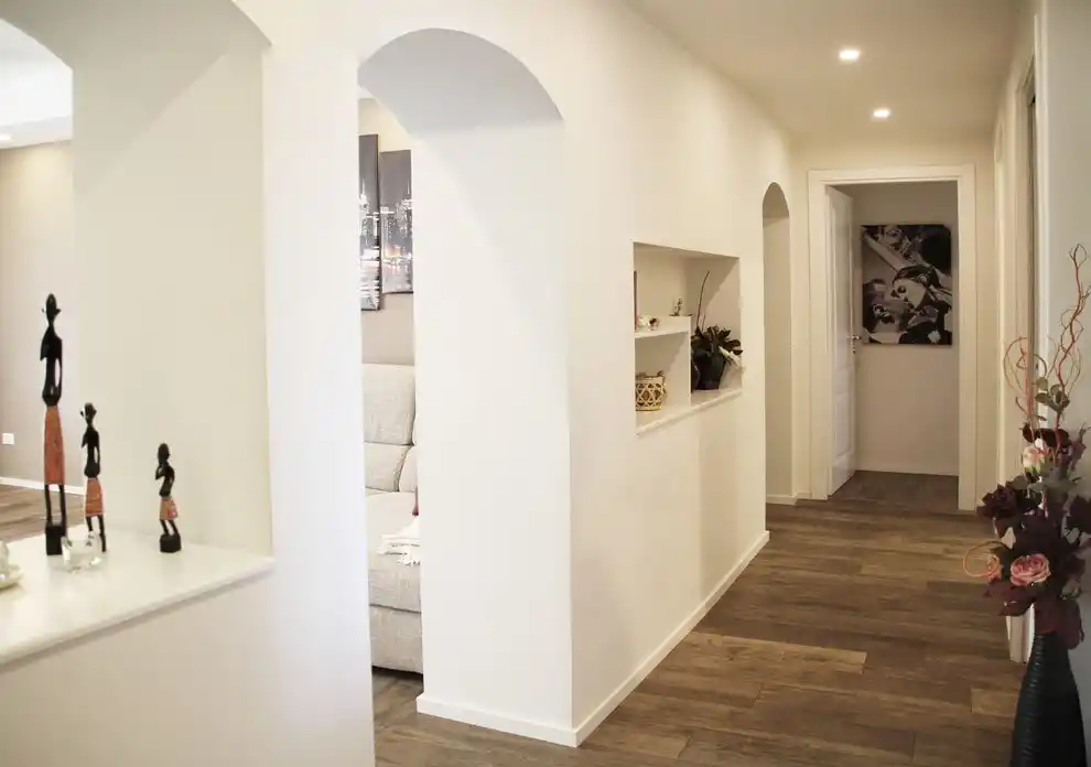 С помощью декоративной арки в стене, получается, не только придать помещению характерности и выразительности, но и создать по-настоящему живописное украшение коридора, которое можно применить для обрамления зеркала, картин, фотографий или использовать нишу для размещения других вещей или предметов мебели, например гардеробной.