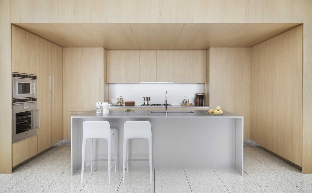 Эта великолепная кухня расположена на втором этаже дома, над гостиной, она прекрасно освещения за счёт наличия большого окна. Встроенные деревянные шкафы высотой от пола до потолка обеспечивают идеальное сочетание с панорамой внутреннего дворика.
