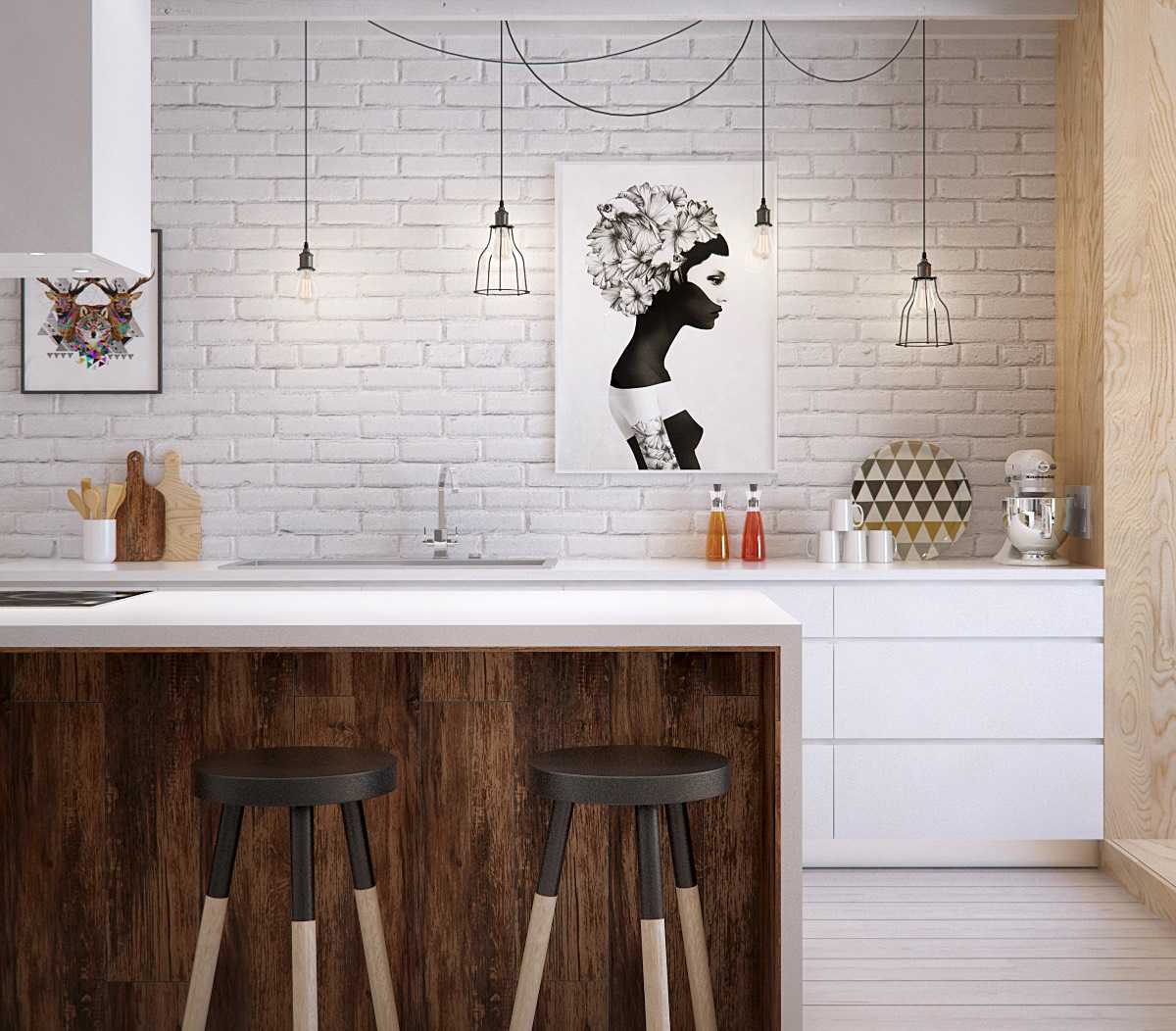 Зачастую на кухнях используют дизайнерскую подсветку, цель которой — подчеркнуть стиль помещения и скорректировать его. Устанавливаются оригинальные фонари, лампы без плафонов или разноцветные гирлянды.