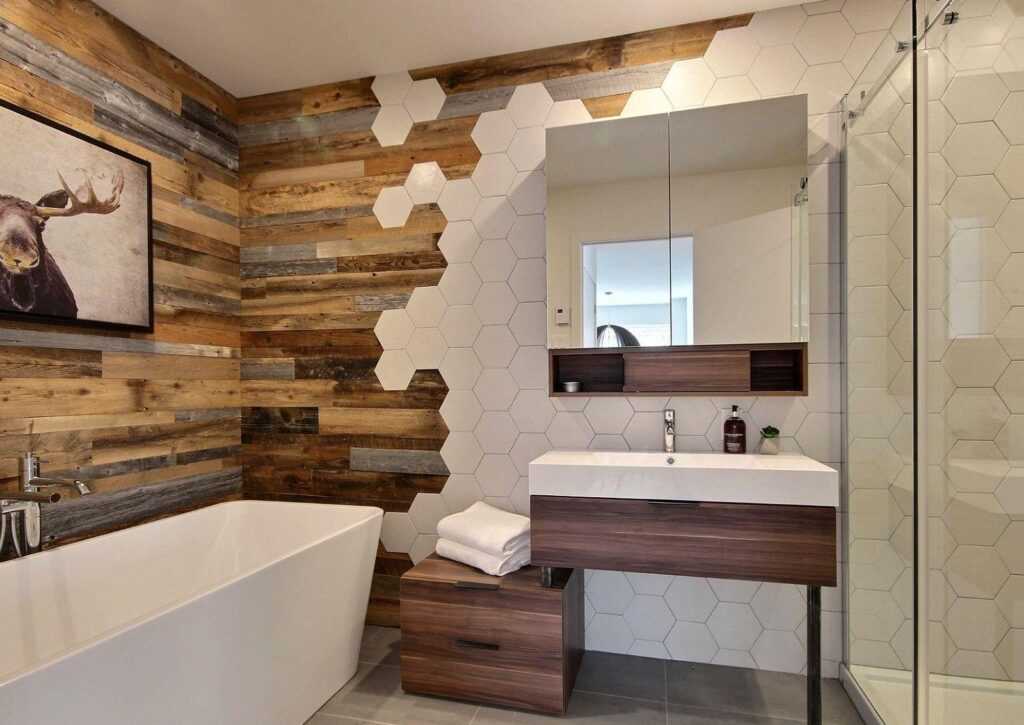 Восьмиугольная плитка непременно будет смотреться оригинально, хотя она не обязательно должна быть на всей поверхности стен и пола. Маленькие решения или мозаика лучше всего подходят для использования в паре с плиткой большего размера. Их можно использовать для отделки корпуса ванны или стен возле раковины или душа.