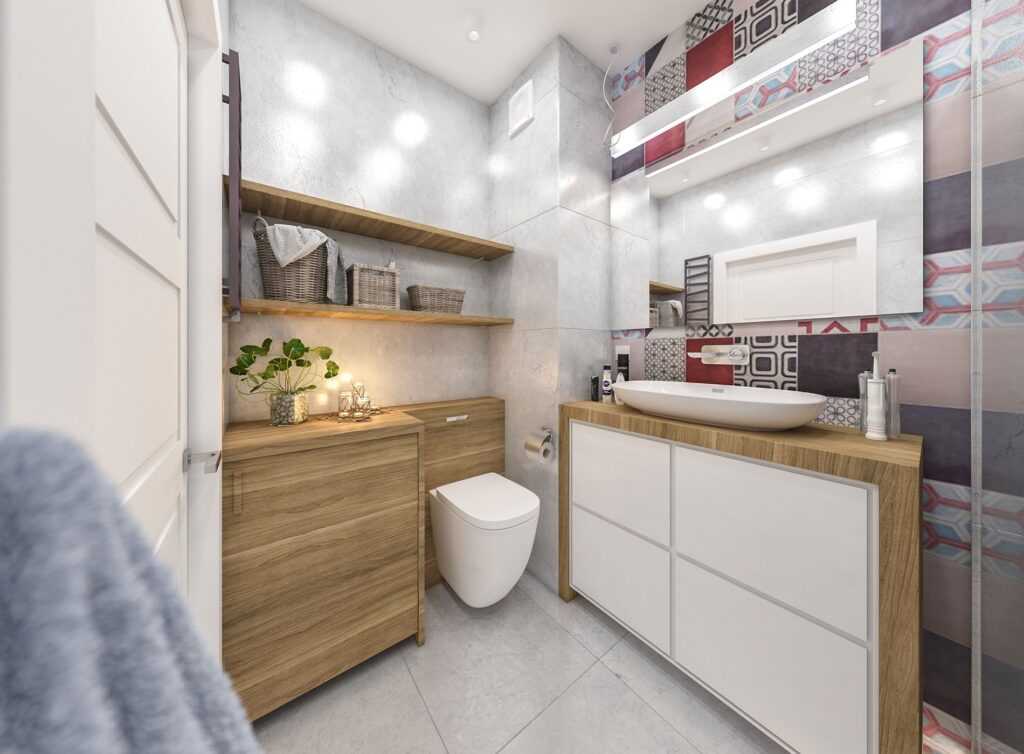 Если вам ближе минимализм и аскетизм, такая ванная может превратиться в место, где преобладают белый цвет и натуральное дерево, подчеркивающие интимность интерьера. Все это обычно присутствует в виде аксессуаров или элементов мебели. Главное правило дизайна – декоративная умеренность. Функциональность и эстетика в виде несложных геометрических блоков – это способ сохранить эргономику в условиях ограниченного пространства.