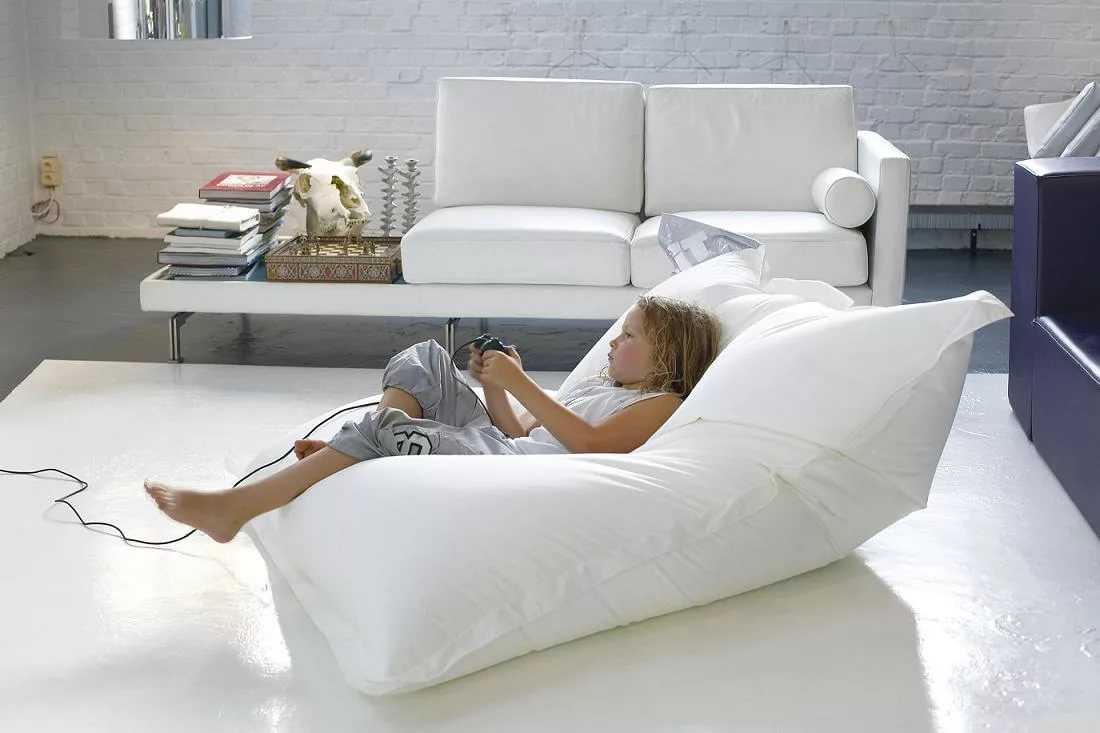 - Кресла-подушки. Мягкие изделия прямоугольной формы могут быть большими и маленькими, порой дополняются удобными пуфами. Некоторые модели оснащаются подголовником, подлокотниками.