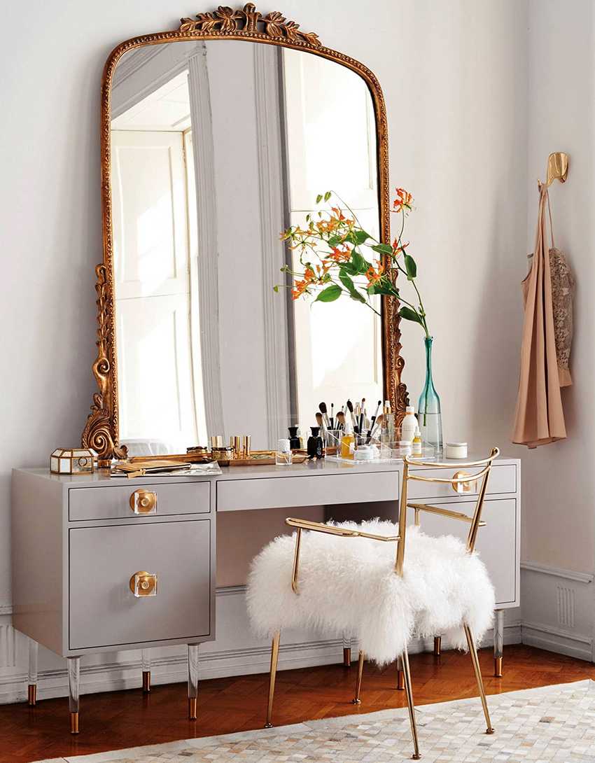 Столик с вращающимся зеркалом – имеет двустороннее зеркало, которое можно развернуть обычной или увеличенной стороной. Оно закреплено на подвижной платформе, поэтому размещать его нужно подальше от стены, чтобы была возможность его развернуть. Он идеален для нанесения макияжа или ухода за вашей кожей. Впишется в средние или большие комнаты из-за особенностей разворотного механизма.