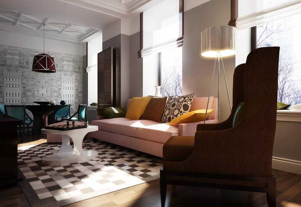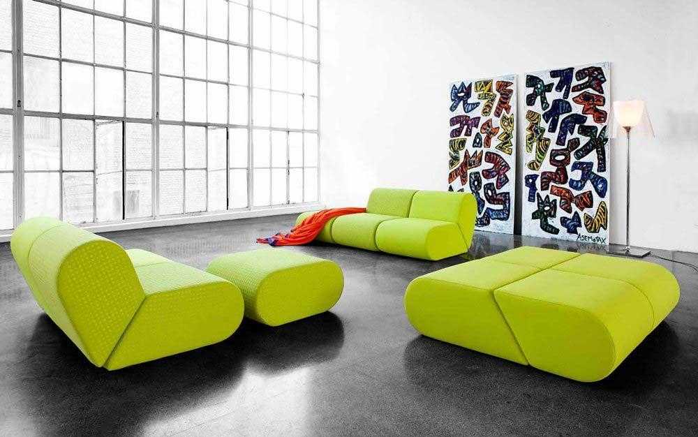 Мелкие скруглённые и витиеватые формы в мягкой мебели для такого стиля будут неуместны. Цвет обивки можно подобрать так, чтобы он составил контраст полу, стенам или крупным предметам интерьера.