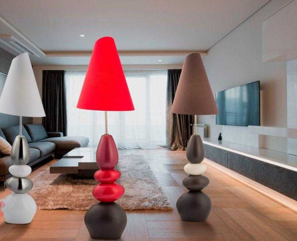 Светильник или торшер интересной формы может играть роль акцента. Если в интерьере достаточно акцентов и без этого, можно ограничиться лаконичными светильниками современного дизайна.