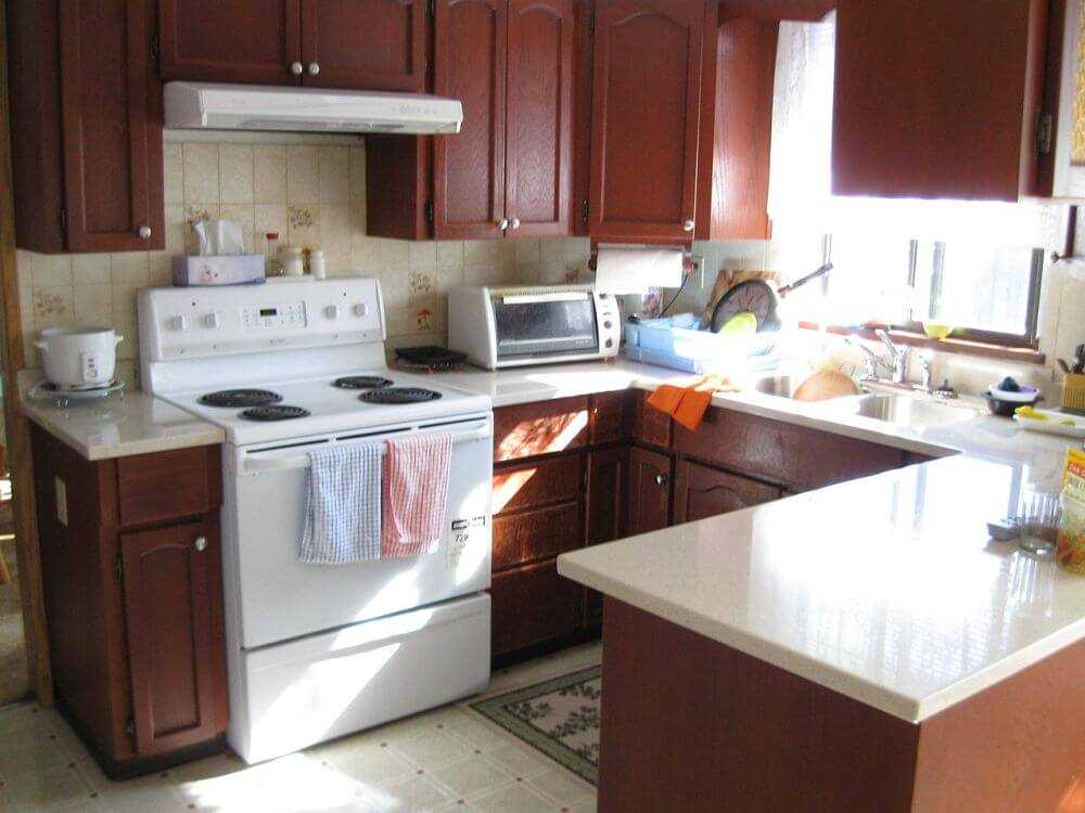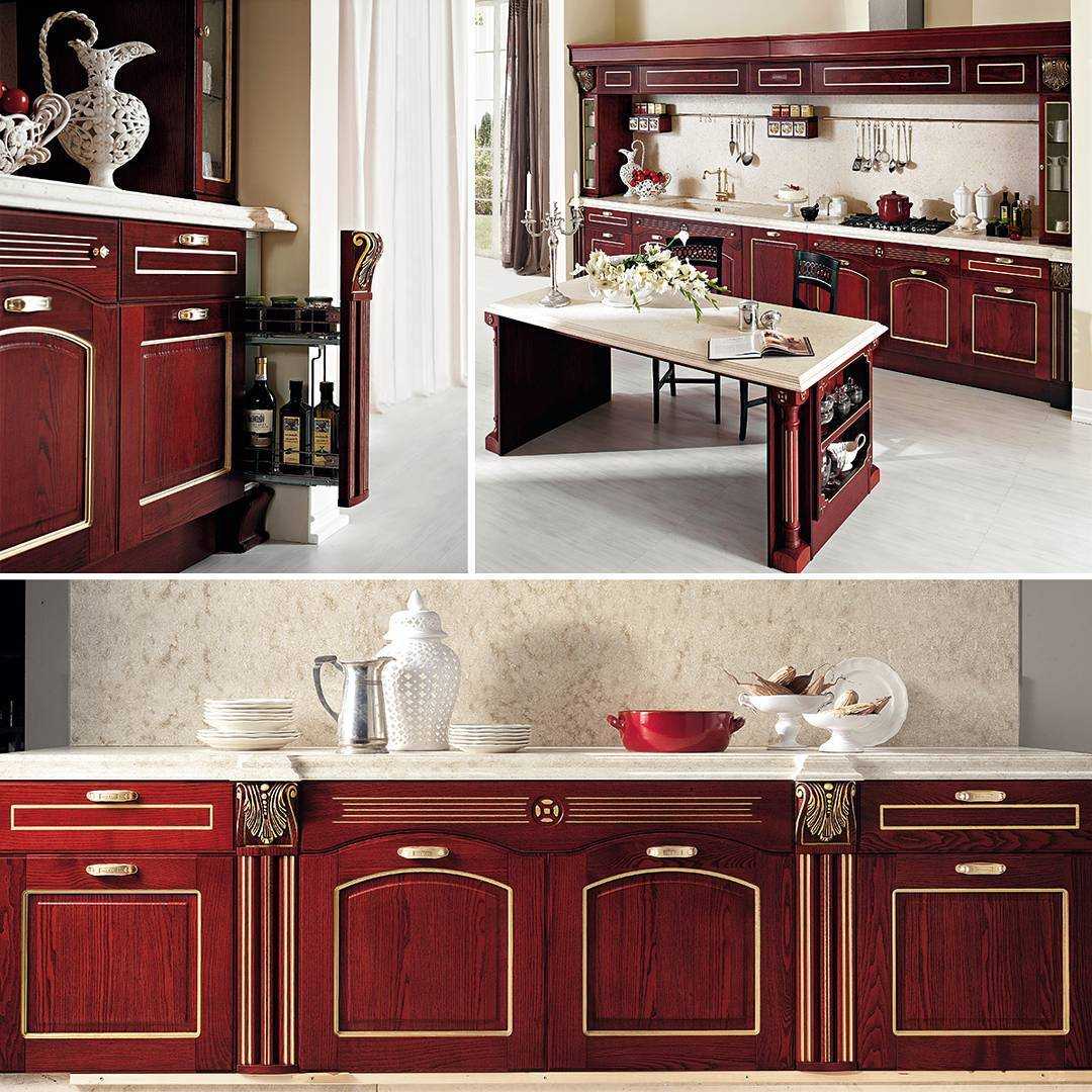 Цвет красное дерево в кухне смотрится солидно и красиво.
