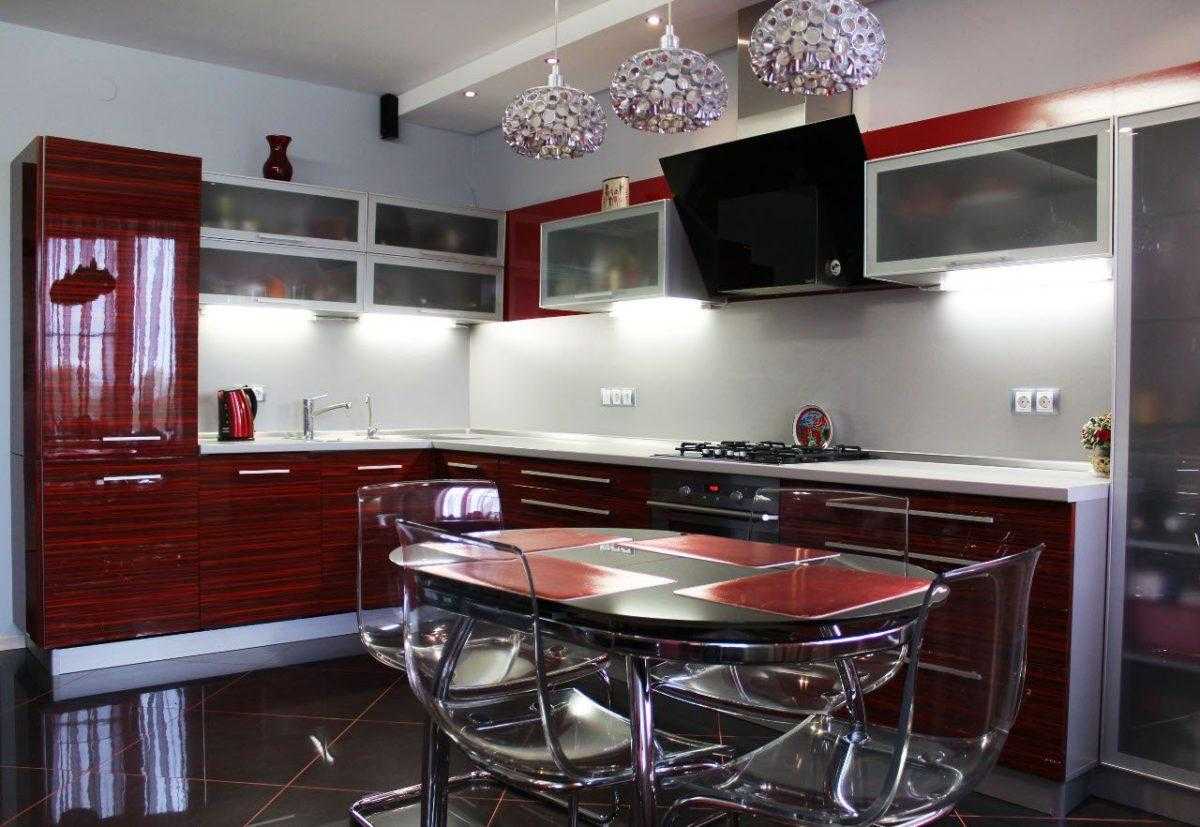 Общее впечатление от интерьера во многом зависит от степени освещённости кухни. Вишнёвая оттенках, поэтому отражающая способность поверхностей не превышает 15—20%. В этом случае необходимо оснастить комнату достаточным количеством светильников.