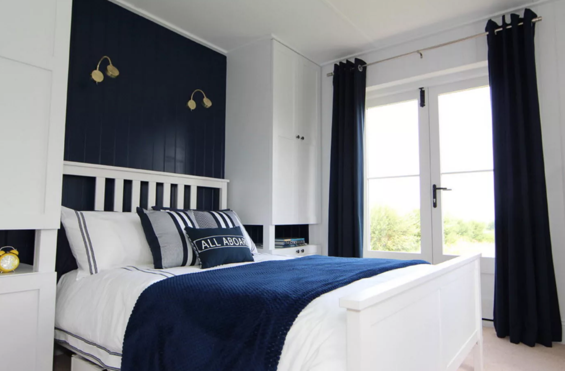 Яркий блюз оптически увеличивает размер маленькой спальни, а насыщенный темно-синий придаст ей элегантности и стиля.