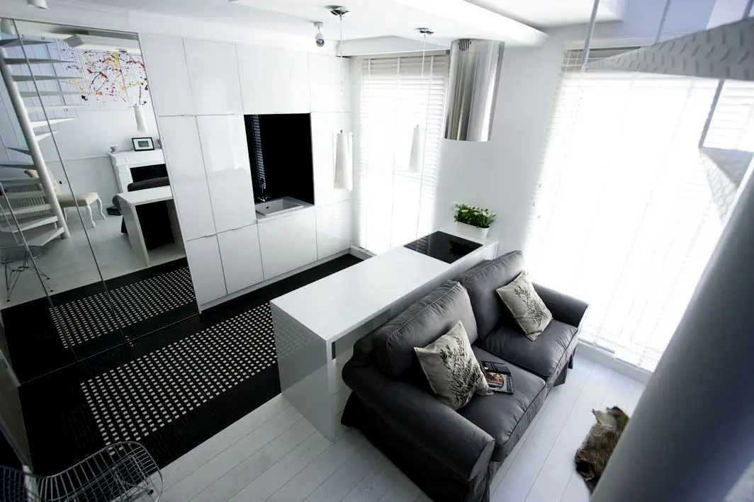Откажитесь от мебели, сделанной в одном цвете – белом либо черном. Более удачным решением станет диван с белой обивкой и темными подлокотниками. Объединить пространство помогут черно-белые обои с мелким орнаментом.
