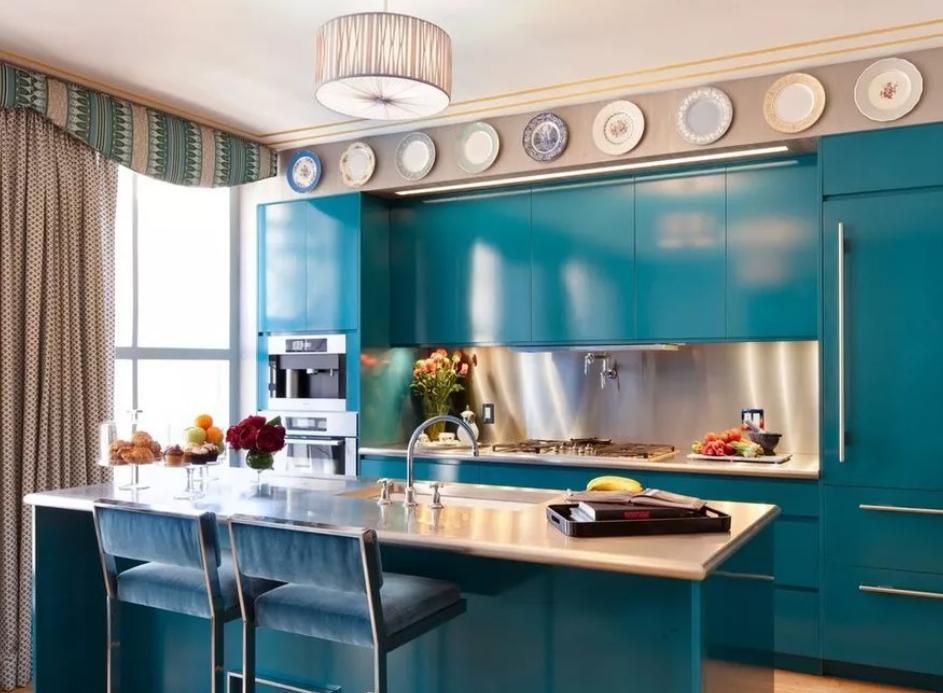 Бирюзовая кухня – смелое исполнение, смотрится свежо и современно. Есть много тонов, можно использовать для большинства стилей, успокаивает. Минус: не подходит для темных помещений, на северной стороне может выглядеть слишком уныло.