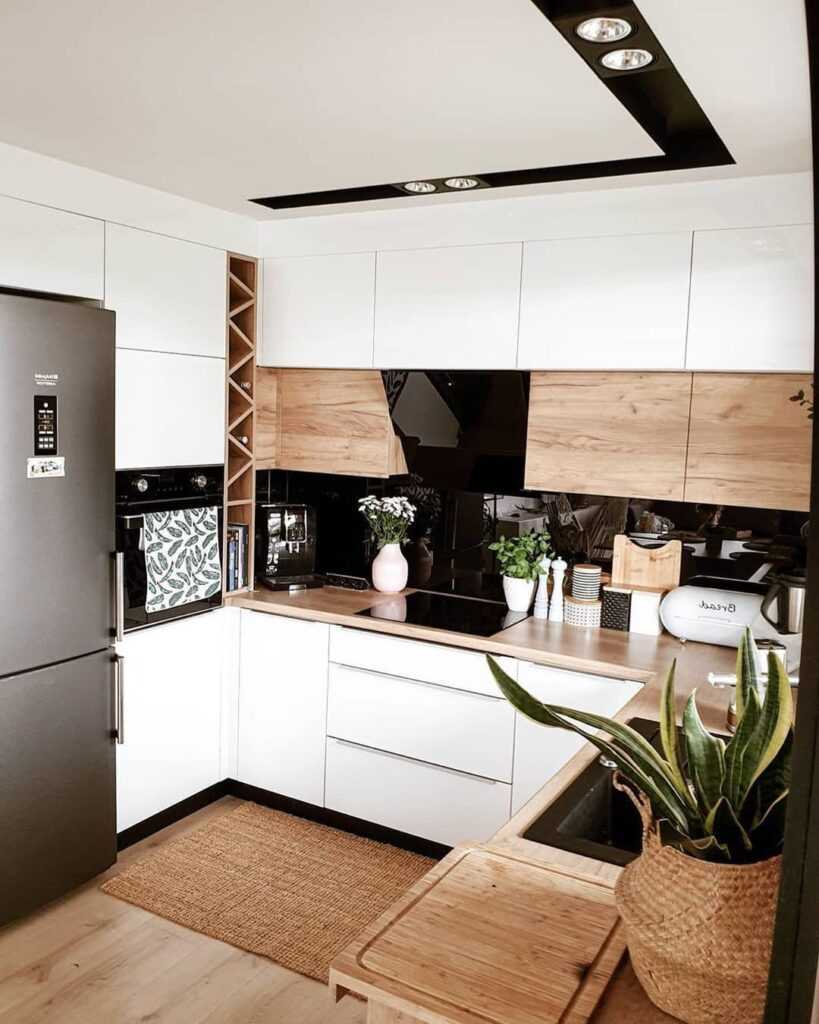 В зонировании кухни можно задействовать потолок. К привычному решению зонирования с выделением уровня добавится цветовая составляющая. Белый потолок как нейтральная часть кухонного пространства не несет особой визуальной нагрузки.