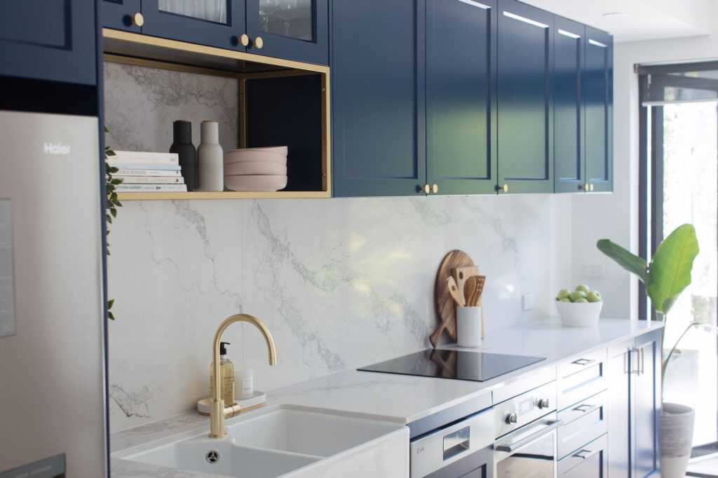 Синий – одно из самых актуальных цветовых решений в этом сезоне для кухни. Расслабляет, гармонизирует внутреннее состояние, дает ощущение прохлады, выглядит стильно. Минус: если его много, повышает тревожность. Темные оттенки уменьшают пространство, снижает аппетит.