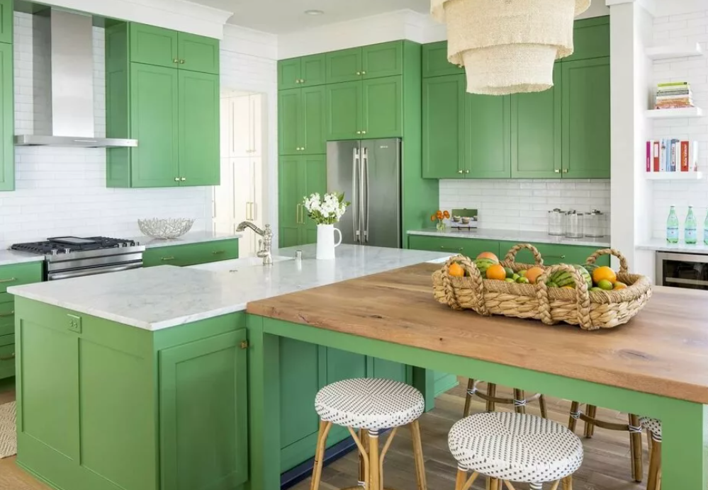 Зеленая расцветка кухонного гарнитура – благоприятно действует на внутреннее состояние, усиливает творческие способности. Как часть интерьера кухни нравится большинству людей, есть огромное количество оттенков. Минус: не со всеми стилями сочетается.