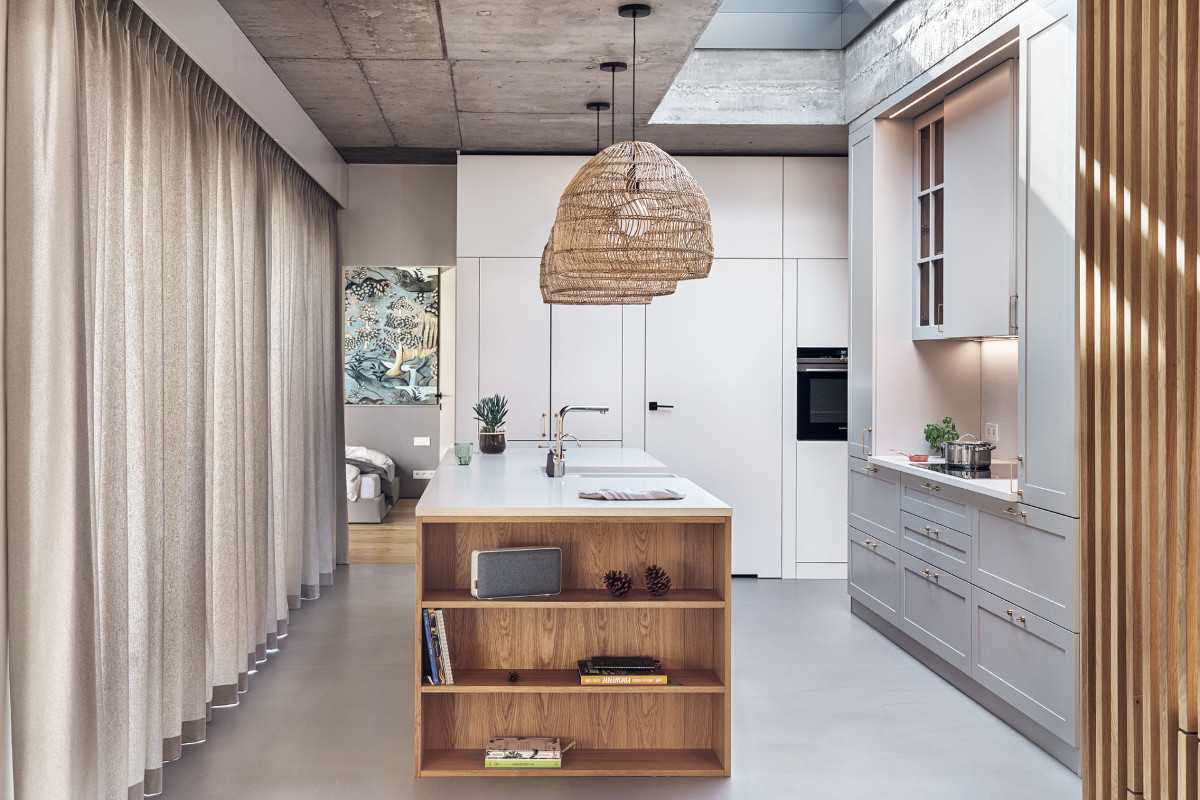 Популярные варианты дизайна – ее совмещение с ближайшей комнатой, обустройство зоны приема гостей или отдыха. Поэтому кухонный гарнитур становится похожим на обычную корпусную мебель. Блестящая выступающая фурнитура заменяется скрытой или системами push-to-open («нажать, чтобы открыть»). Кухня может включать не только стандартные полки и ящики, но и книжные стеллажи, небольшое рабочее место, ниши для видео- или аудиотехники.