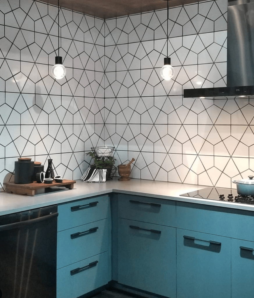 Использование орнаментов или рисунка при выборе цветового решения пола также является практичным. Данный тип фона скроет мелкий мусор и поможет разбавить однотонные стены, гарнитур и потолок. Нетривиальным решением для половой керамической плитки будет использование восточного орнамента в сине-голубых тонах. Такой пол будет основным акцентом и даст возможность разбавить его однотонными стенами и гарнитуром.