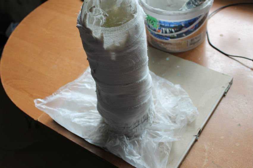Оказывается, даже гипсовые бинты могут стать украшением необычной вазы, создаваемой своими руками. Для этого разводят гипс, делают из него раствор, пропитывают им бинты либо обычные отрезы ткани небольшой ширины и обматывают ими вазу.