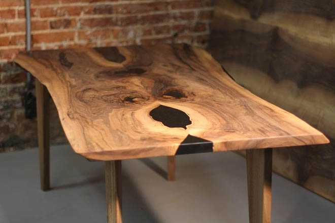 Выбирая стол из необработанного дерева, нужно обратить внимание на сырье, из которого он сделан. Для производства может использоваться любая древесина, но предпочтение при изготовлении отдают твердым видам, обладающим плотной текстурой