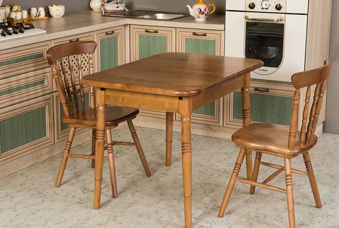 Для небольших кухонь советуем выбирать раскладные столы, оснащенные складывающейся крышкой, или же раздвижные модели, имеющие дополнительные секции. За деревянным столом-книжкой смогут разместиться порядка 10 гостей, но в сложенном виде он займет столько же места, сколько и стандартная тумба.
