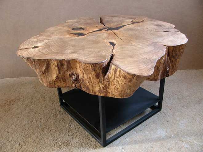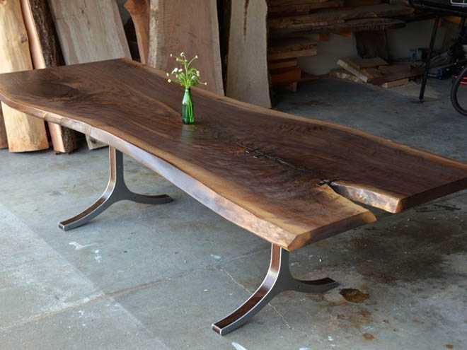 Особую нишу занимают столы из слэба. Это понятие означает продольный спил из цельного куска дерева. Каждое изделие обладает уникальной формой и рисунком. Кромочную часть оставляют в исходном состоянии, чтобы подчеркнуть природную красоту.