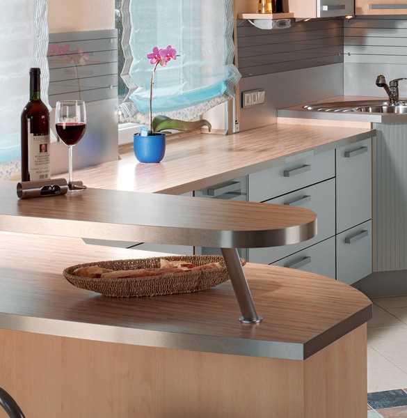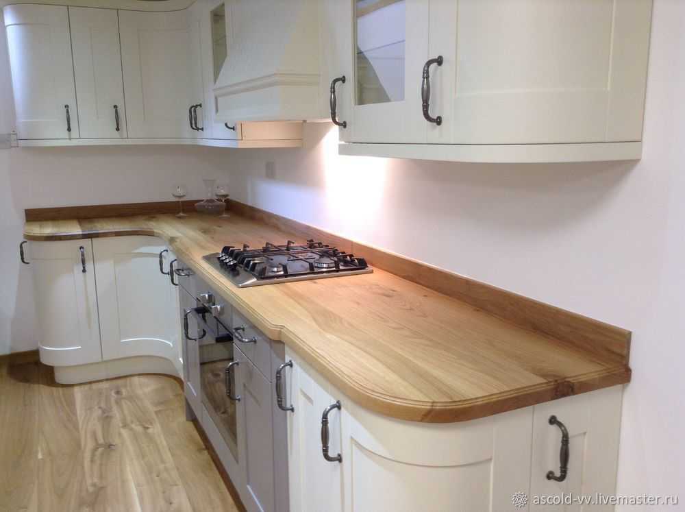 Особое внимание привлекают столешницы из массива нестандартной формы, будь то овал для кухонного островка или другое более сложное геометрическое решение. Также в наше время пользуются большой популярностью деревянные столешницы для кухни с обработкой торцевой кромки в виде фрезеровки различных фасонов