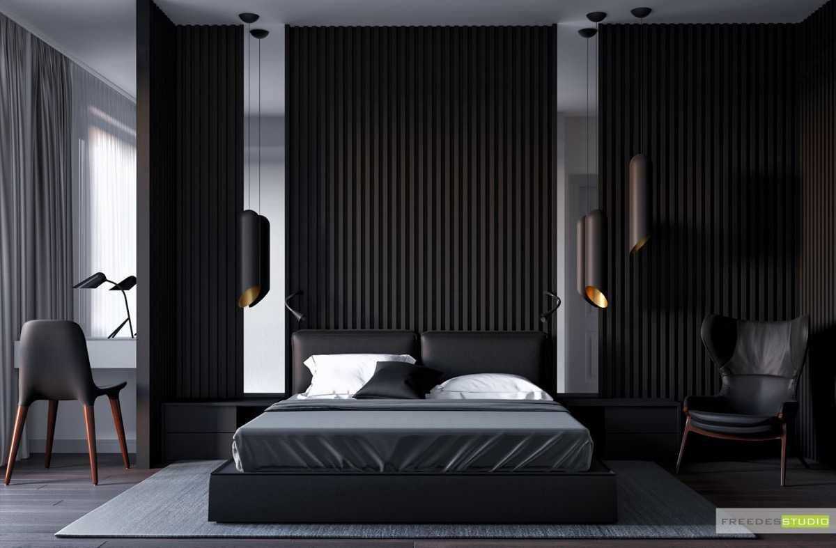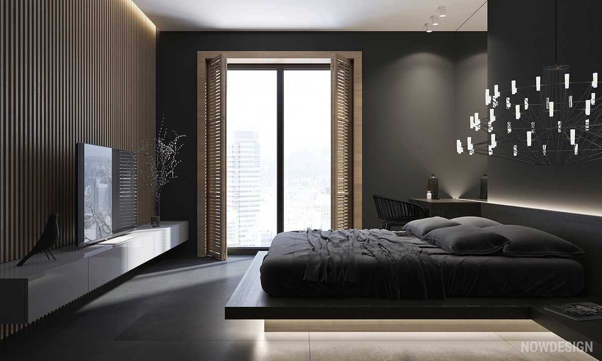 Спальня в оттенках чёрного станет отличным фоном для дизайнерских люстр и светильников. Этот цвет словно усиливает блеск стекла и хромированных элементов. Грамотно подобранное освещение создаёт непринуждённую и игривую атмосферу в, казалось бы, угрюмой чёрной спальне. Теплоты добавляют лампы жёлтого цвета, а усилить эффект минимализма поможет холодный спектр ламп.