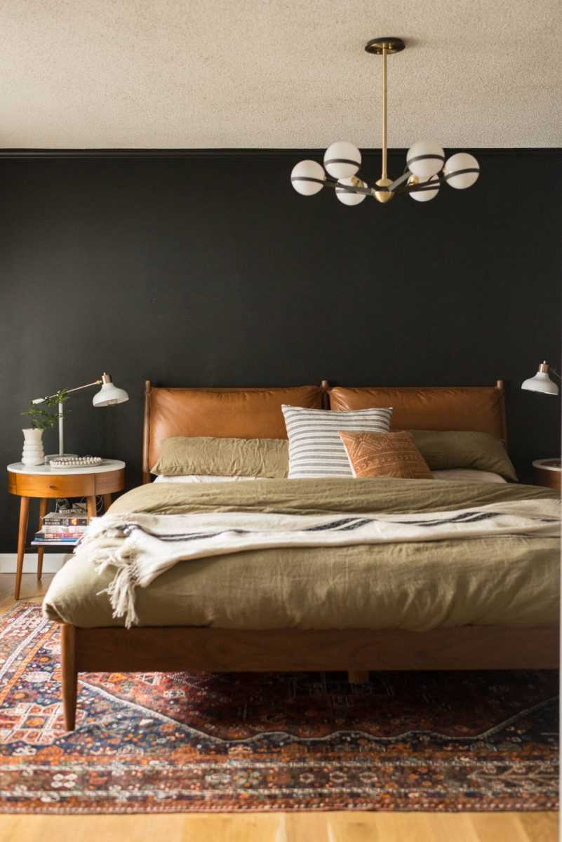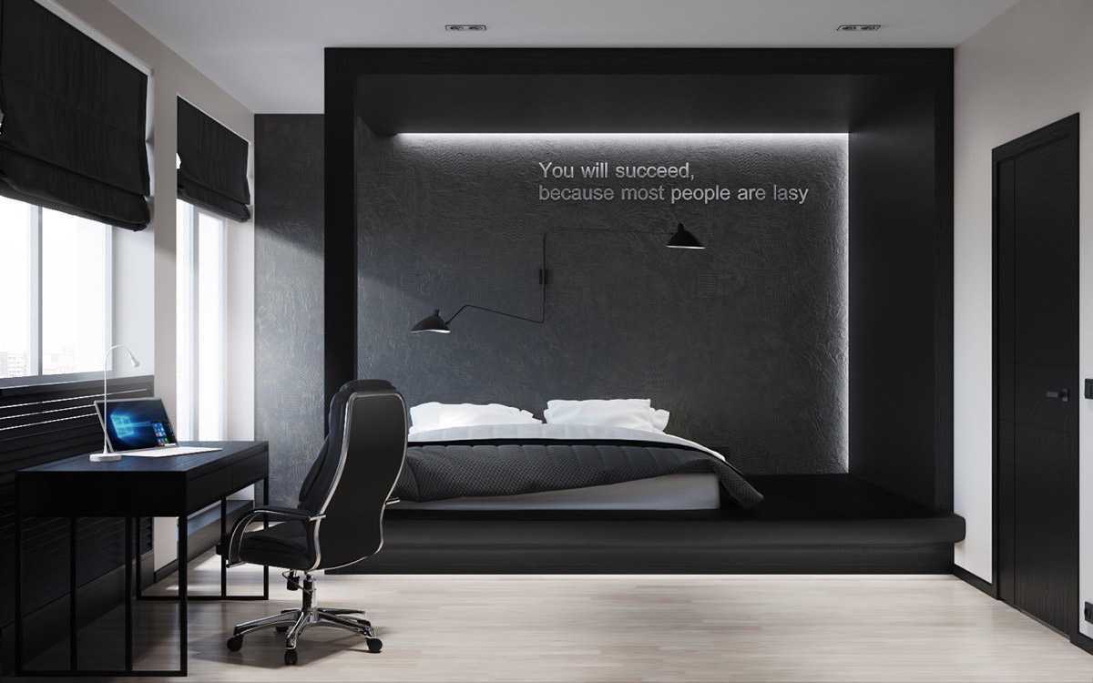 Черный может быть уместен на любой детали интерьера. Этот цвет может быть на полу, на стенах и даже на потолке. Главное, что нужно постоянно помнить — чисто черные стены подойдут только помещению большой площади. В небольшой спальне стены должны в большей части оставаться светлыми.