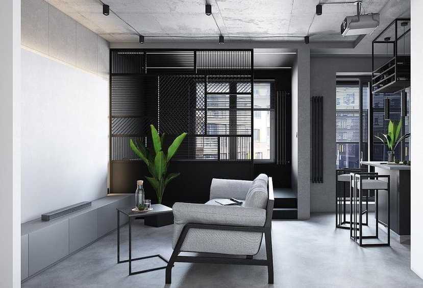 Проект может служить примером совместного использования чёрного и серого в стиле лофт. В студии пространство около окна отведено под спальную зону, оно отгорожено прозрачной перегородкой и отдельно выделено цветом.