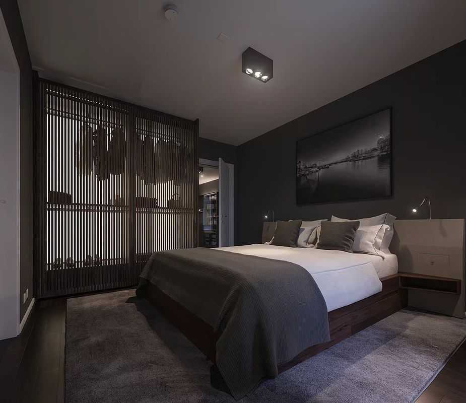 Спальня в темных тонах – задача сложная, при малейшей ошибке можно сделать обстановку мрачной и неуютной