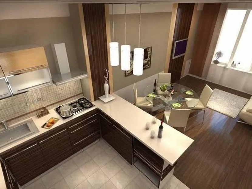 Угловая (Г-образная). Оптимальный вариант для большинства помещений — гармонично вписывается в дизайн и позволяет организовать пространство с учетом эргономики (треугольник «плита, холодильник и раковина»). При угловом расположении кухни мягкая мебель (диван) устанавливается спиной к более длинной части зоны готовки.