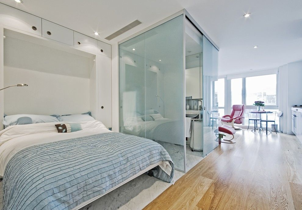 Конечно, в таких условиях сделать разделение на функциональные участки реальными стенам не выйдет, а вот легкие перегородки в виде ткани или шкафов вполне подойдут. Оригинальные решения, которые можно применить в любом стиле: