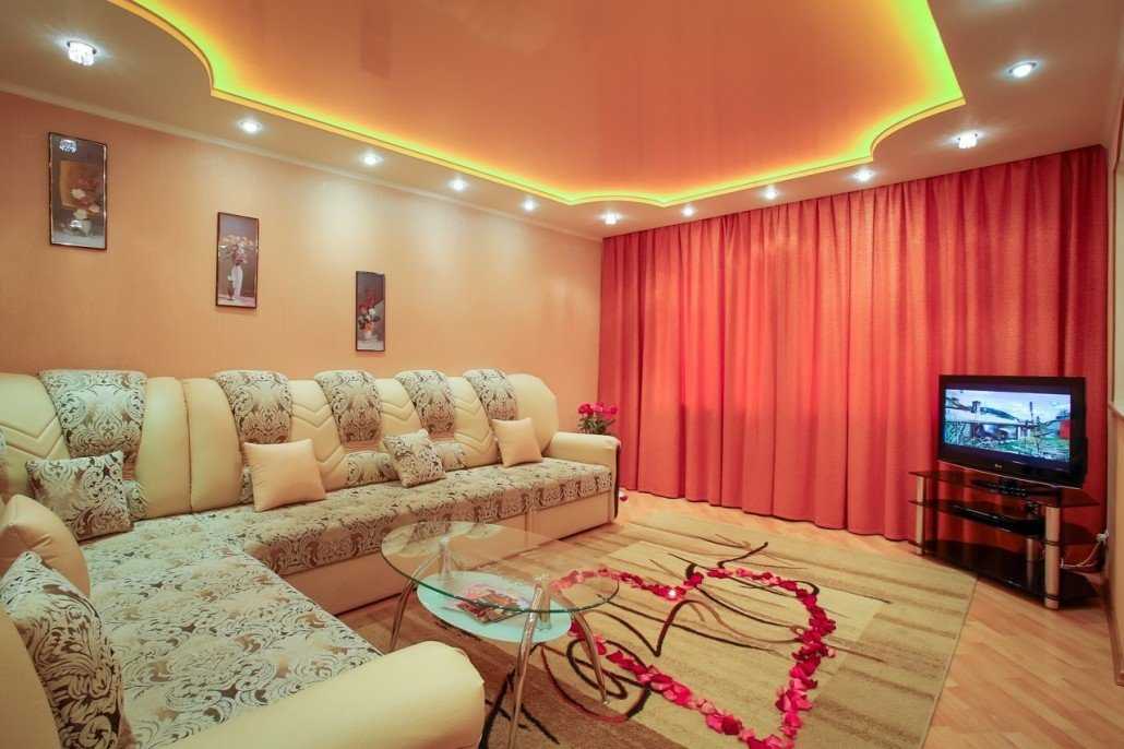 Двухуровневые — подходят для помещений с высотой не менее 2,5 м. При желании делаются в квартирах с невысокими потолками, но 2 уровень идёт только по периметру и служит для установки подсветки. Смотрятся необычно и стоят относительно недорого. Двухуровневые конструкции раскрывают массу возможностей для дизайнерских фантазий: можно варьировать уровнями, цветовыми оттенками и играть светом. С помощью такого потолка легко поделить пространство на отдельные зоны (гостиную, столовую, зону отдыха).