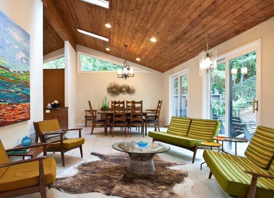Из ярких цветов в гостиной актуальны все природные оттенки зеленого. Даже яркие и травянистые, потому что они как раз вписываются в концепцию актуальных трендов.