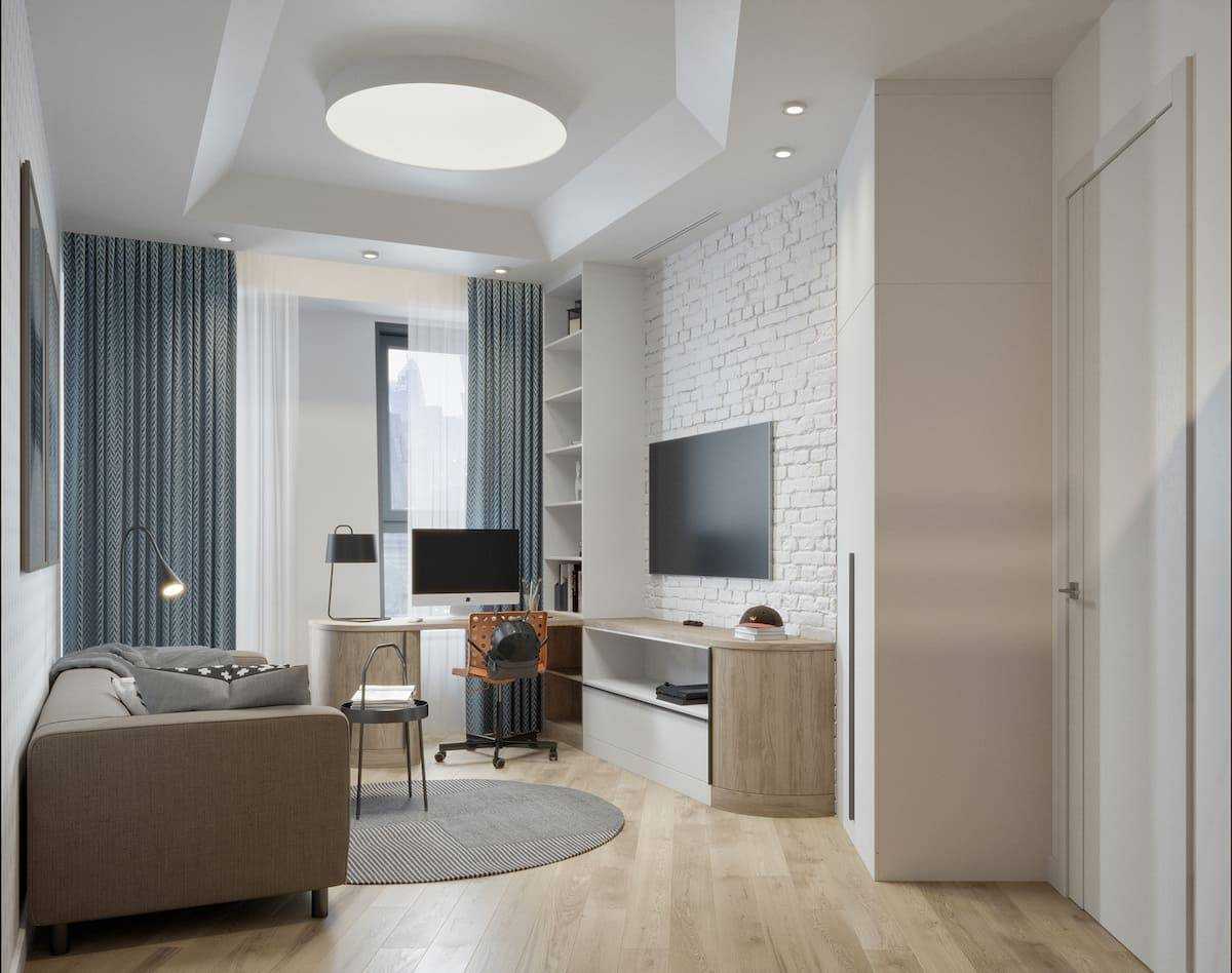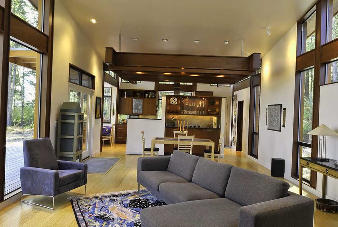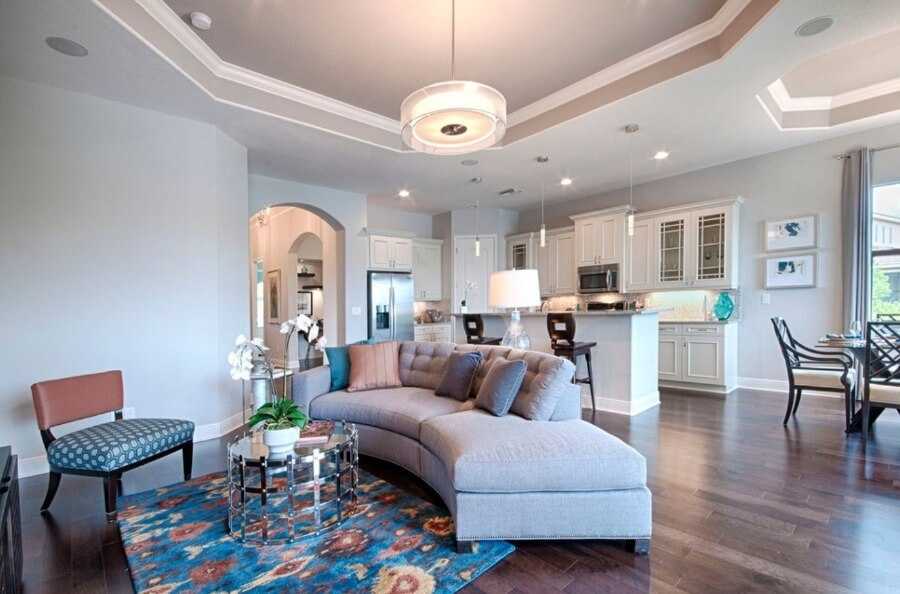 Еще одна современная тенденция — это зонирование помещений при помощи многоуровневых подвесных потолочных конструкций. В идеале визуальные границы повторяются в решении полового покрытия.